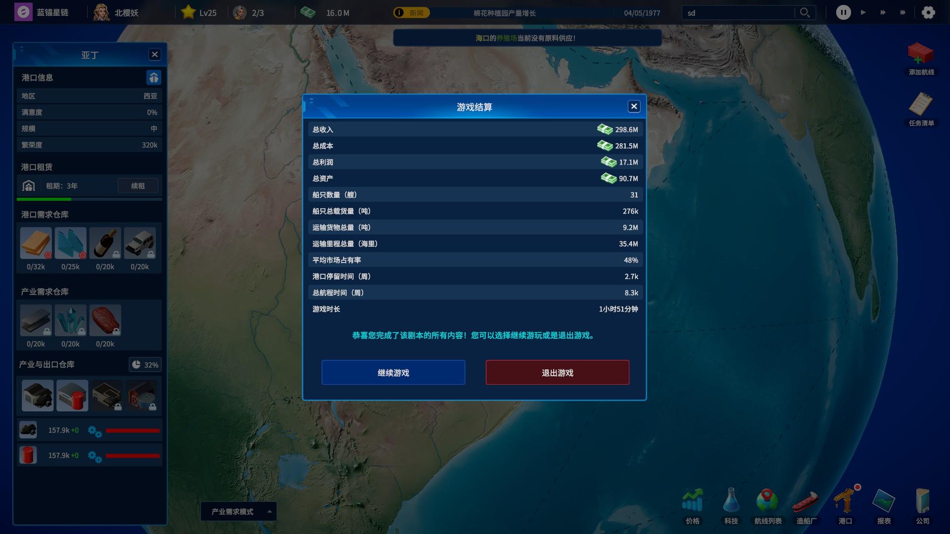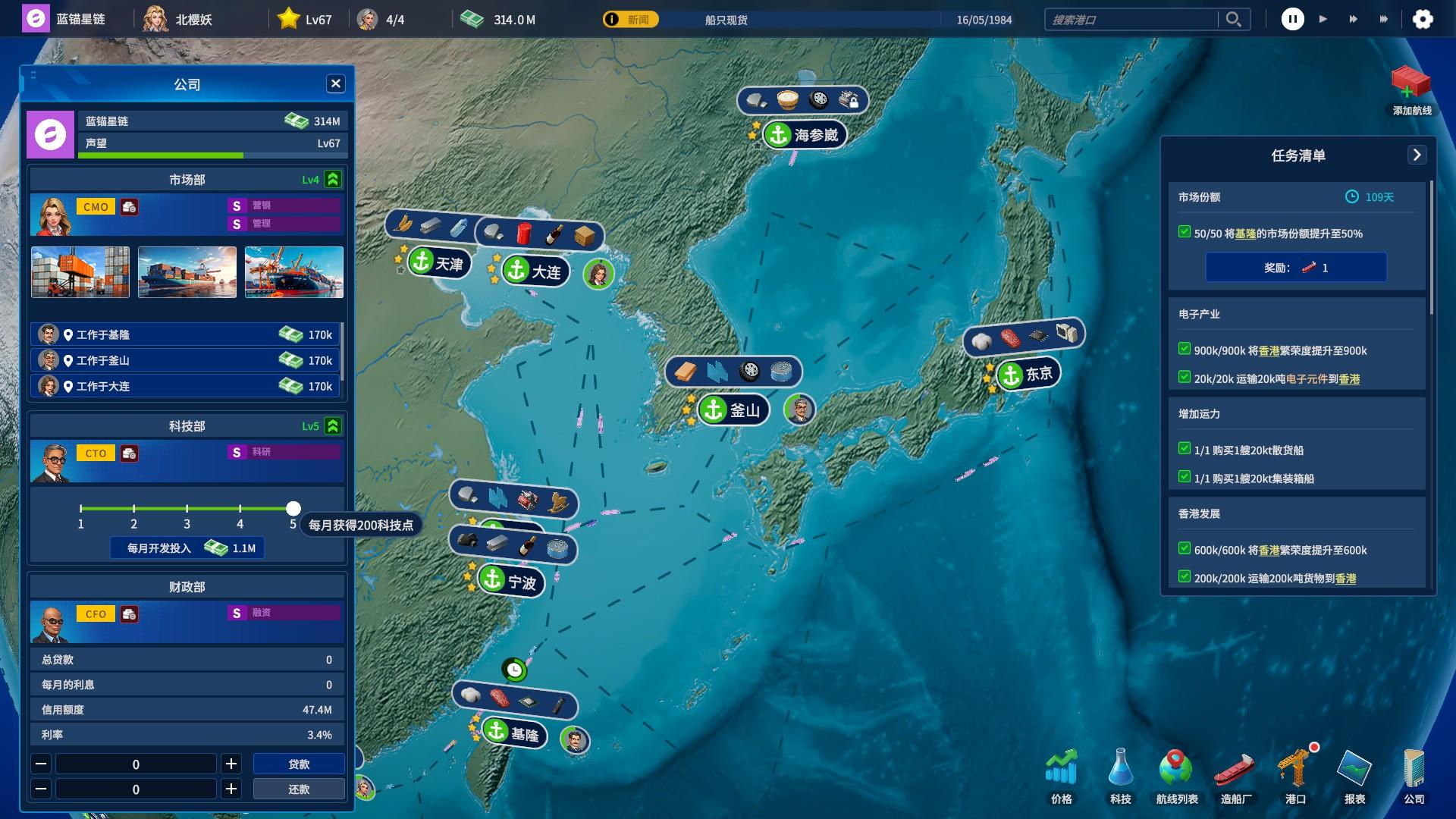 是的,游戏几乎没有什么运营的压力,虽然有着供给需求、科技研究、航运规划等机制玩法的存在,但其核心本质还是“水多了加面,面多了加水”,只要约5小时左右就能完成全科技研究,而游戏大部分的时间都在查看某个港口的需求,接着做航线的规划。