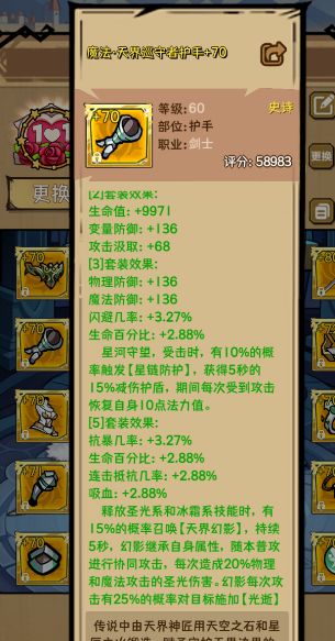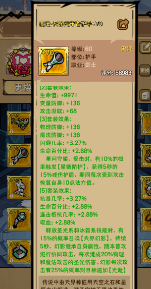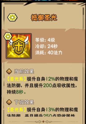 抵御圣光:这是一个防护类技能,提高自身的物理和魔法防御,并且有伤害吸收效果,同样是目前由于等级低,基础属性低,这样的百分比效果,暂时不是很好,后期肯定不错,搭配格挡挥砍,应该不错。