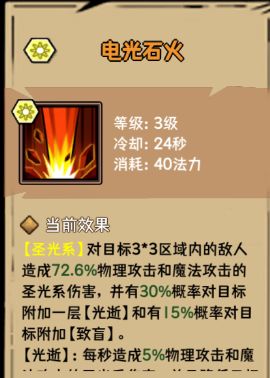 电光火石:从技能描述上看,一个3*3范围的群体技能,叠加光逝和致盲效果