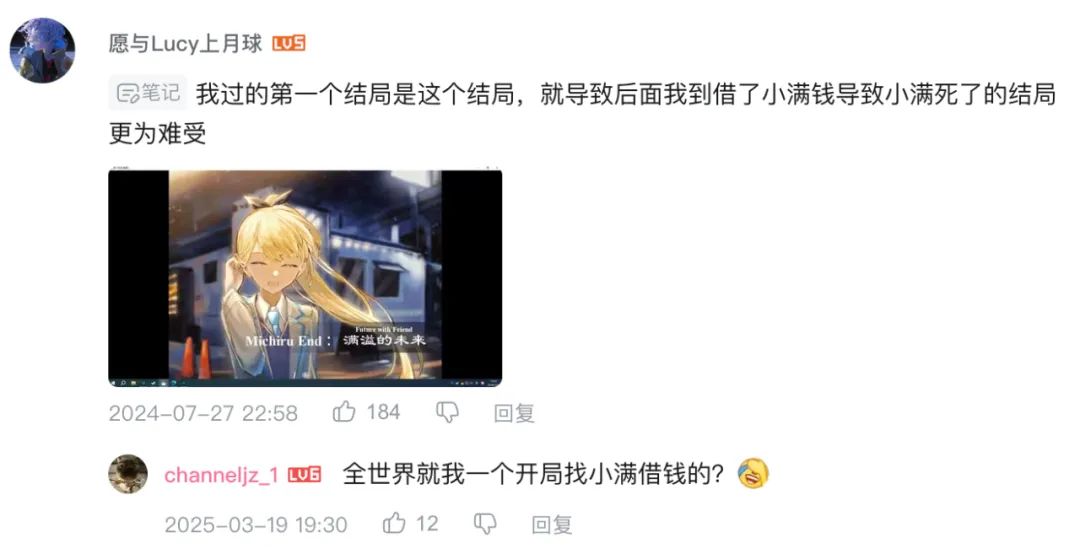 越青告诉我,在设计剧情的时候,他有刻意引导玩家一开始就去和小满对话,就像我上文写的,问小满借钱,走向BE,然后去解锁其他周目——这会是一个比较“正统”的顺序,玩家受到的冲击会比较大。