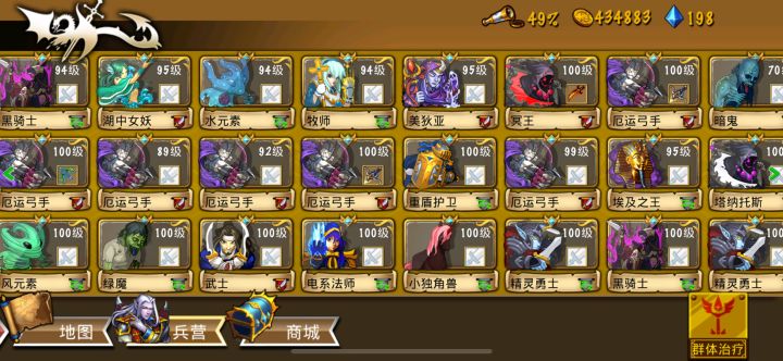 七八年前玩的游戏了,最近下载回来发现新英雄玩又玩了起来,德古拉阵容分享。塔纳托斯打前排输出,亡灵弓手专职打BOSS。前期无卡关,六章一边推一边培养也不回无聊