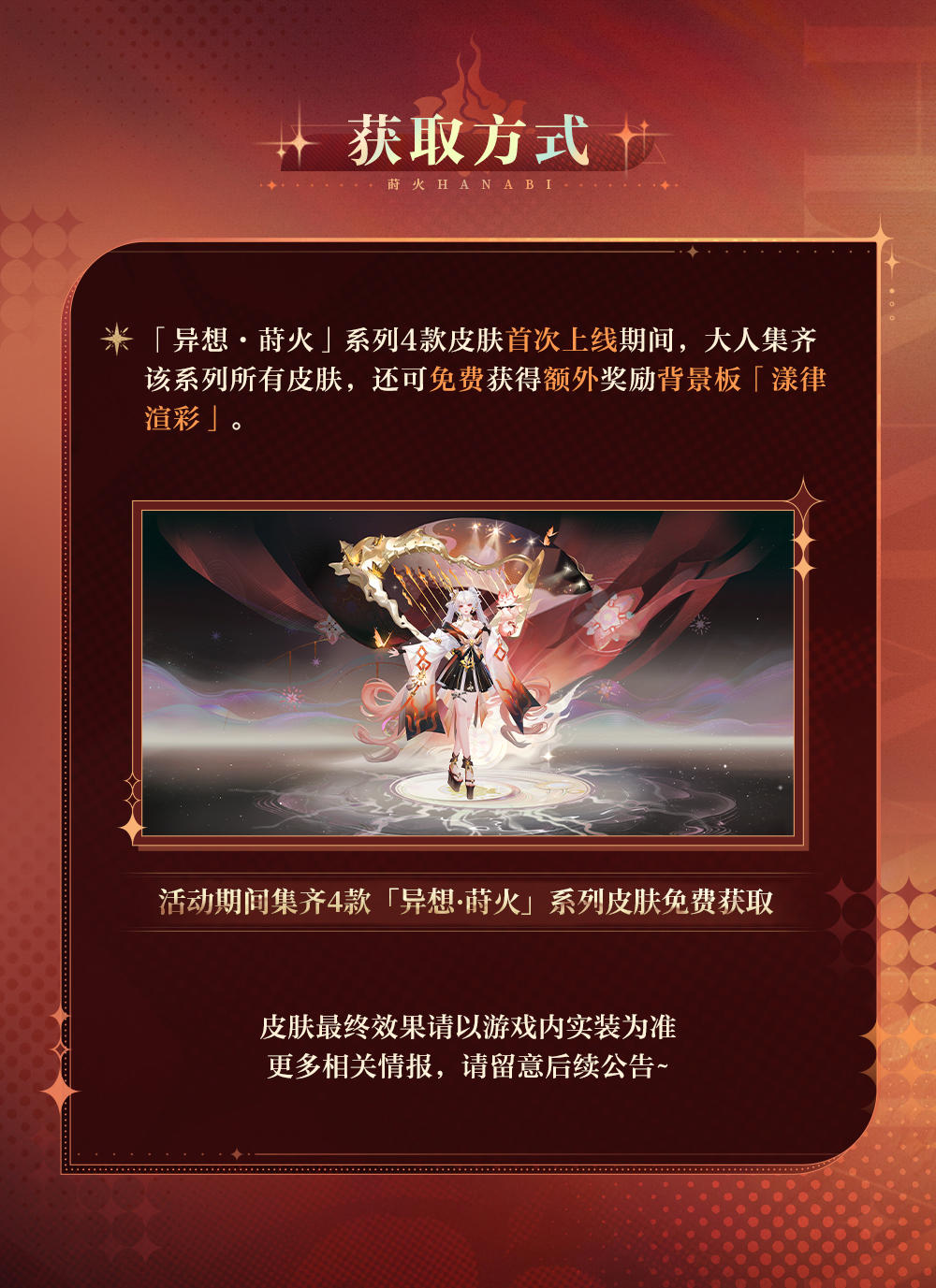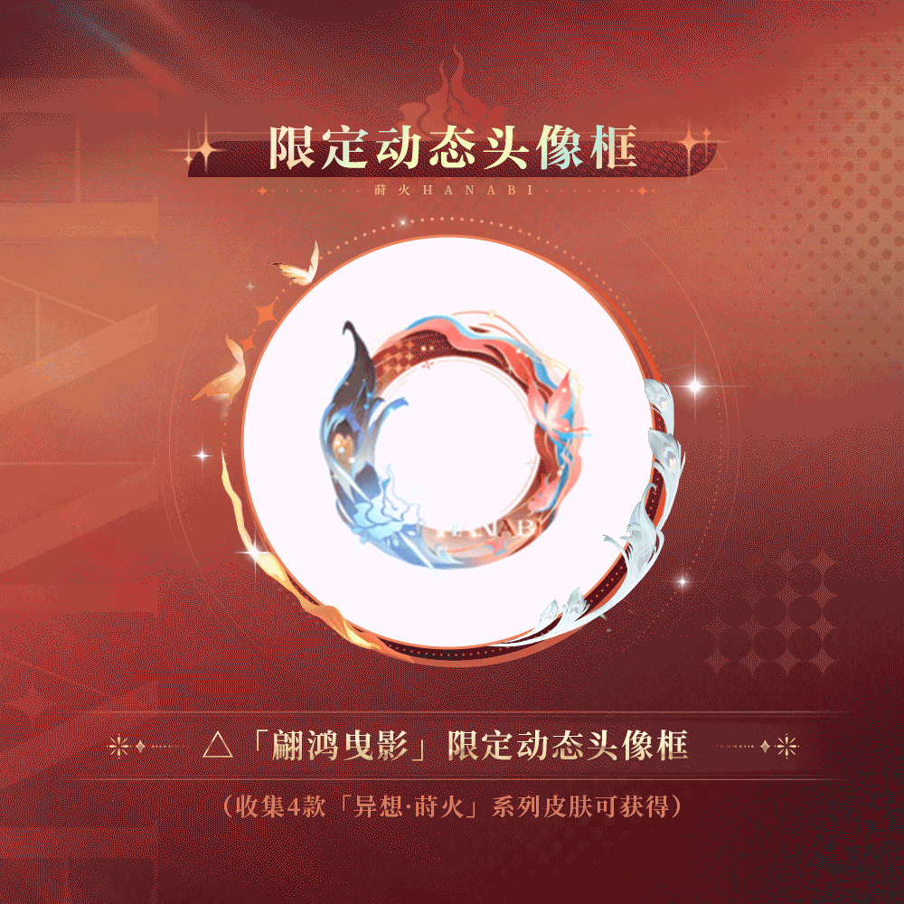 ※「异想·莳火」系列皮肤共4款,大人获得该系列的不同款数皮肤,可对应解锁限定插画「浮光声屿」、限定动态头像框「炽火烁音」、限定插画「浅憩定格」、限定动态头像框「翩鸿曳影」等收集奖励。