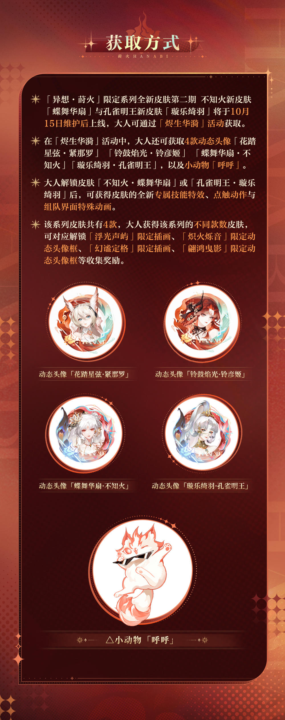 ※在「烬生华漪」活动中,大人还可获取4款动态头像「花踏星弦·紧那罗」 「铃鼓焰光·铃彦姬」 「蝶舞华扇·不知火」「璇乐绮羽·孔雀明王」,以及小动物「呼呼」。