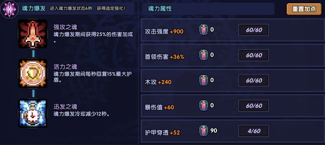 魂力属性优先满足护穿暴击需求,点满首领、木攻、爆伤后再点攻强和无限攻强即可