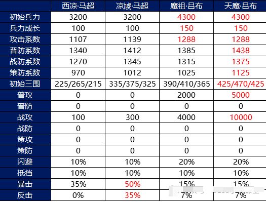 其中【凉虓·马超】的高暴击和高反击比较亮眼,通过其他的系统加成很容易就能叠到100%,其余的攻防属性与【魔祖·吕布】并没有太大的差距。
