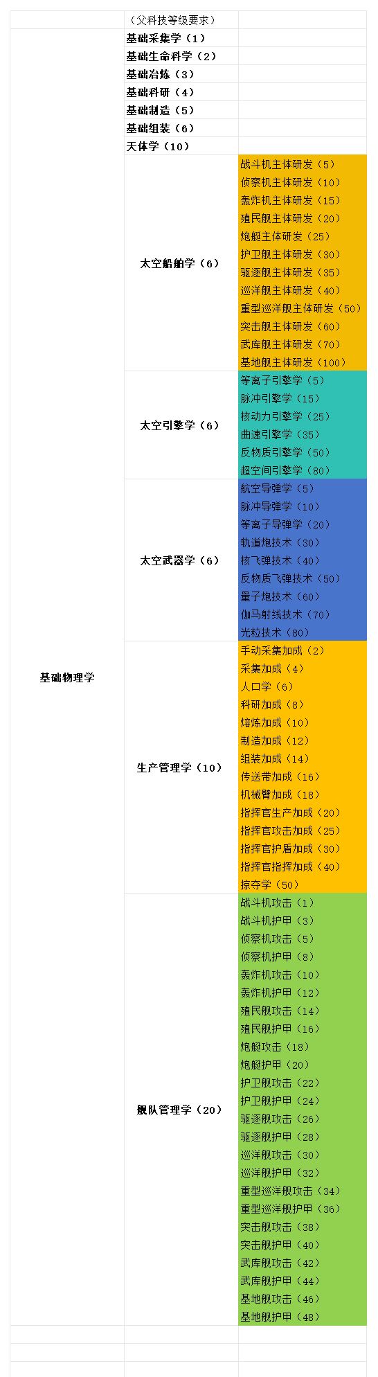 以下是科技解锁列表,括号内为父科技等级解锁要求