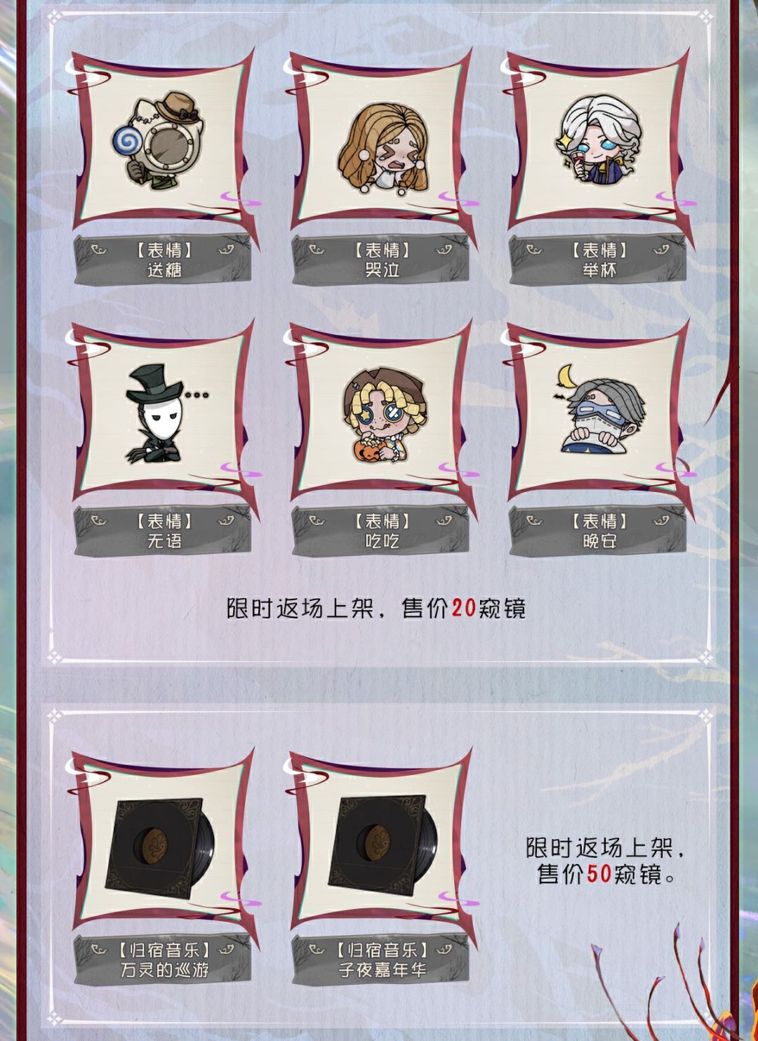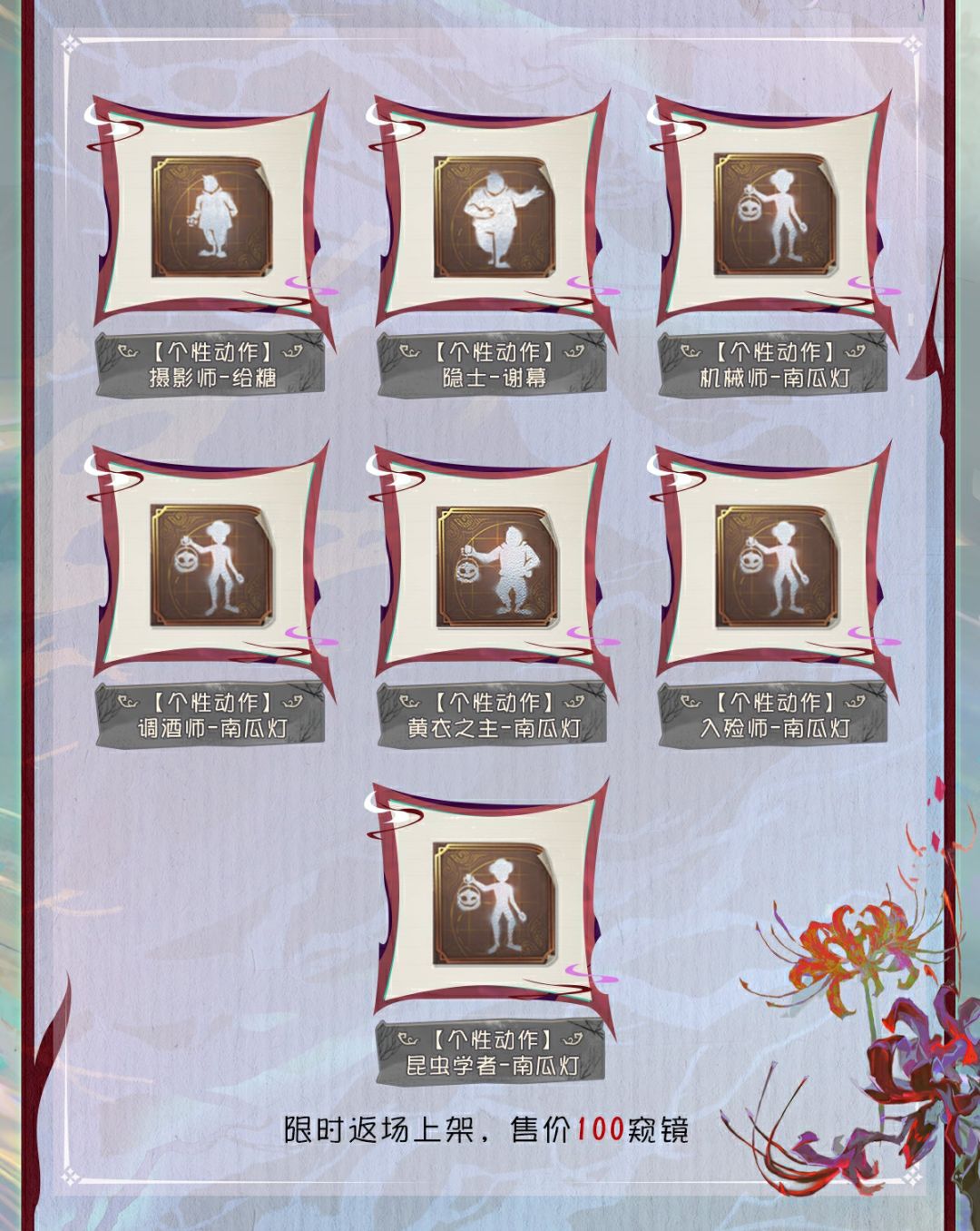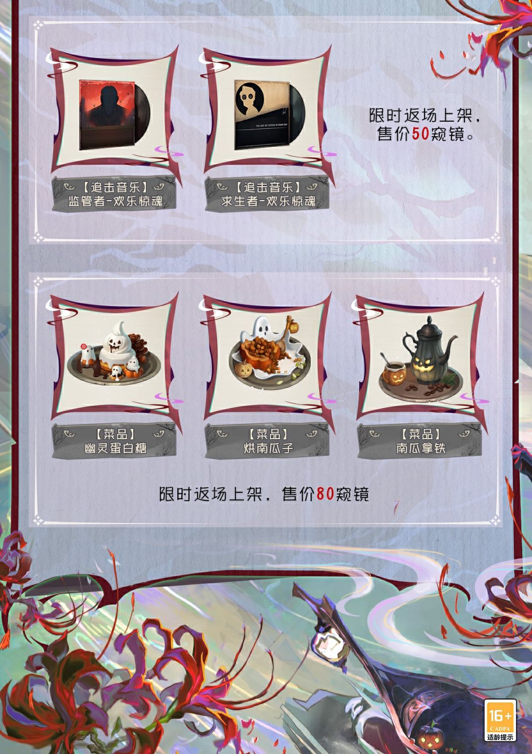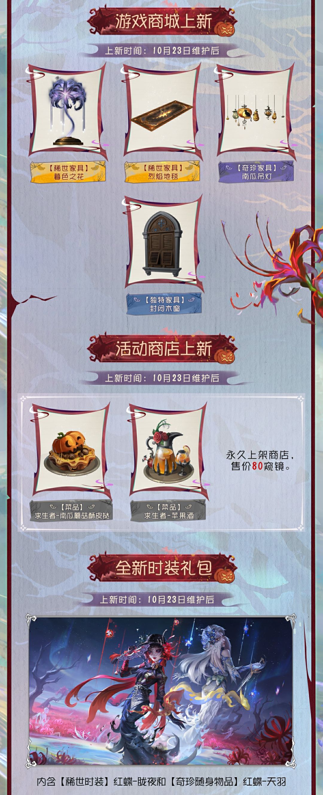 10月23日维护后,主题活动开启,参与即可赢取【奇珍时装】作曲家-暮影、【独特时装】火灾调查员-尘光、【独特随身物品】求生者通用-南瓜提灯、头像、头像框、家具和表情等奖励。红蝶稀世时装礼包、主题家具、菜品等全新内容也将上架商城。