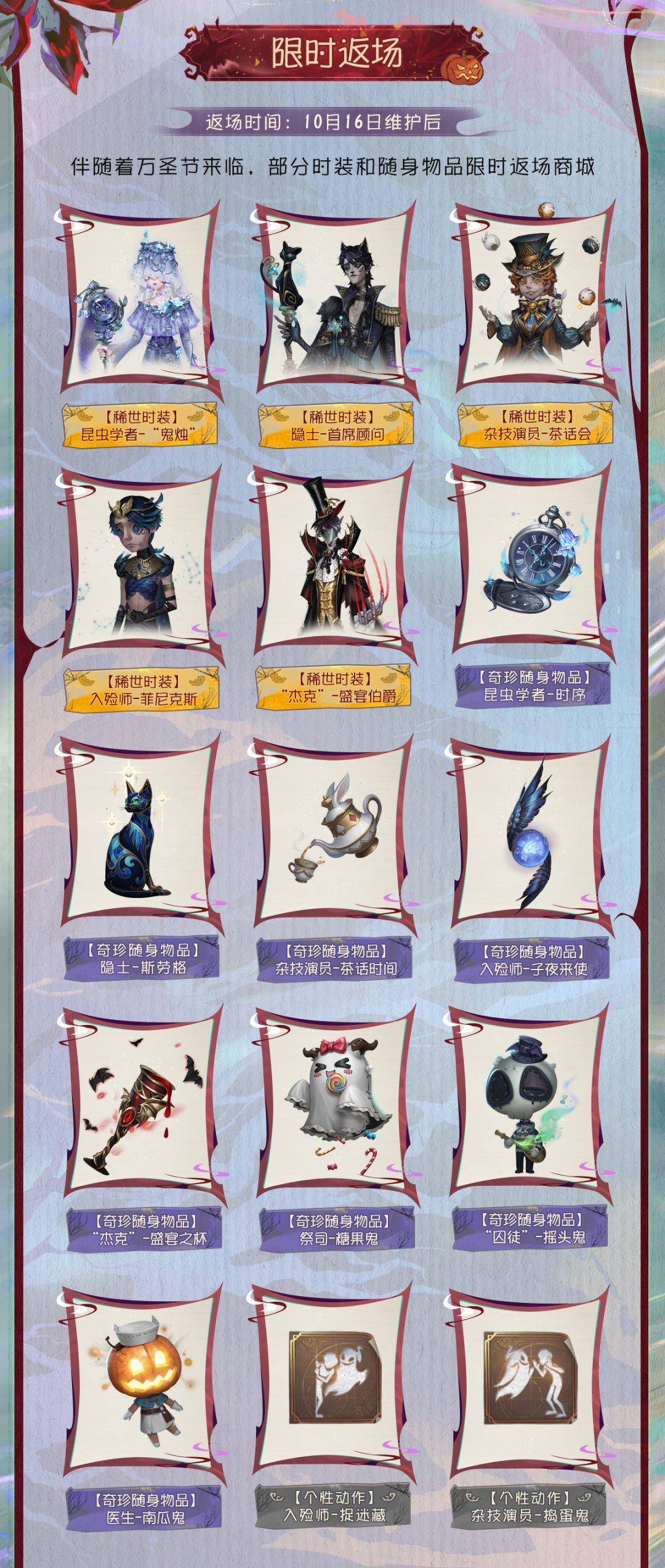10月16日维护后,往年万圣节主题活动时装、随身物品、个性动作和家具等返场上线。