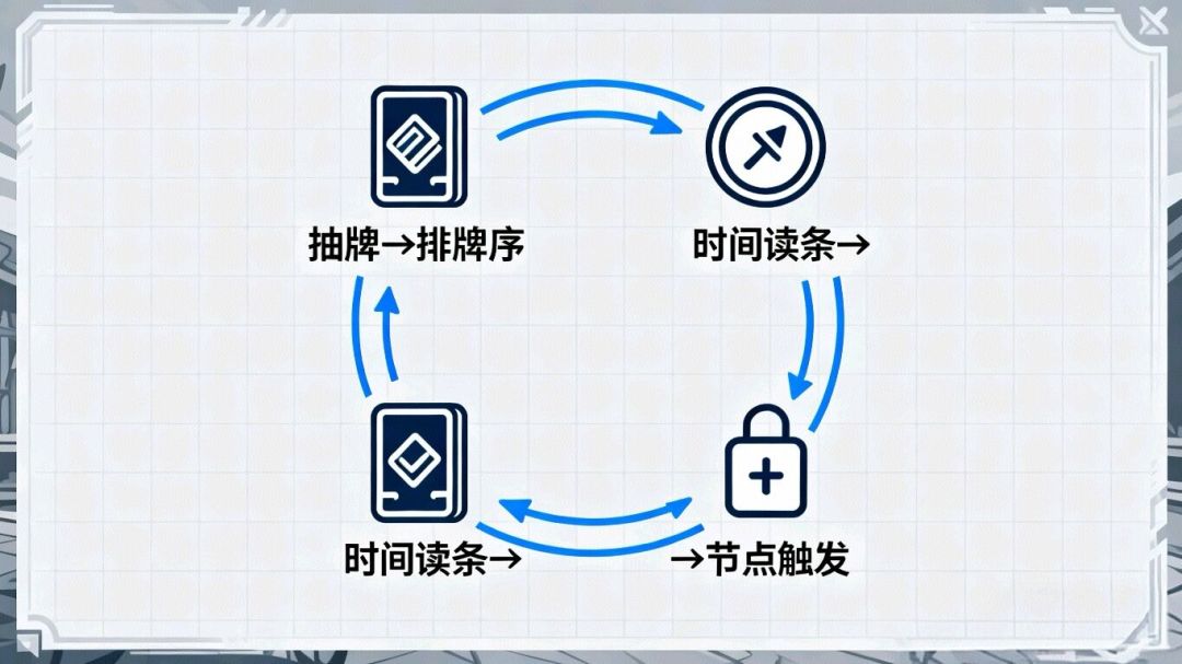 遵循“抽牌→安排牌序→时间读条→节点触发”的闭环。敌我双方读卡条公开,敌人行动意图(特殊天赋除外)清晰可见,玩家可预判并通过攻击、道具、技能三种牌型取胜。再通过特定情况下触发“数据乱流”机制,获得意想不到的效果。