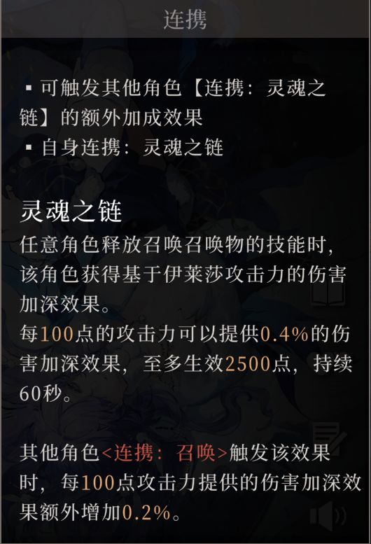 《灵魂之链》任意角色释放召唤召唤物的技能时,该角色获得基于被动效果持有者攻击力的伤害加深效果,每100点的攻击力可以提供0.4%的伤害加深效果,最多2500点。持续60秒。其他角色<连携技:召唤>触发该效果时,每100点攻击力提供的伤害加深效果额外增加0.2%。
