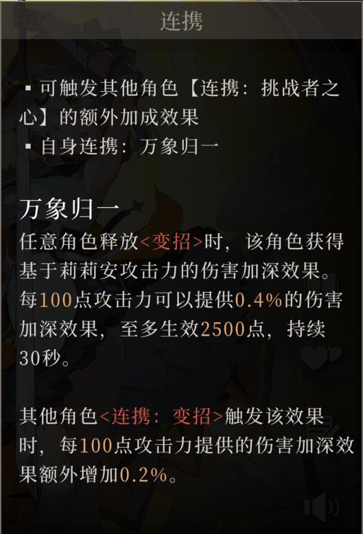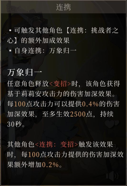 《万象归一》任意角色释放变招时,该角色获得基于被动效果持有者攻击力的伤害加深效果,每100点的攻击力可以提供0.4%的伤害加深效果,最多2500点。持续60秒。不可叠加,刷新持续时间。其他角色<连携技:变招>触发该效果时,每100点攻击力提供的伤害加深效果额外增加0.2%。