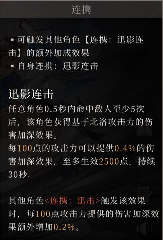 《迅影连击》任意角色0.5秒内命中敌人至少5次后,该角色获得基于被动效果角色攻击力的伤害加深效果,每100点的攻击力可以提供0.4%的伤害加深效果,最多2500点。持续30秒。其他角色<连携技:迅击>触发该效果时,每100点攻击力提供的伤害加深效果额外增加0.2%。