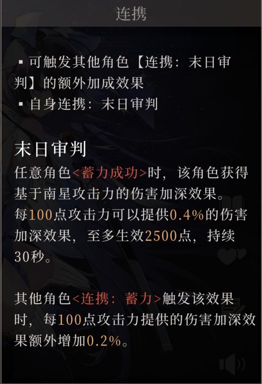 《末日审判》任意角色【蓄力释放成功】时,该角色获得基于被动效果持有者攻击力的伤害加深效果。每100点的攻击力可以提供0.4%的伤害加深效果,最多2500点,持续30秒。其他角色<连携技:蓄力>触发该效果时,每100点攻击力提供的伤害加深效果额外增加0.2%。