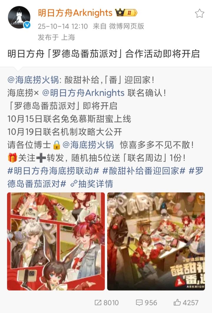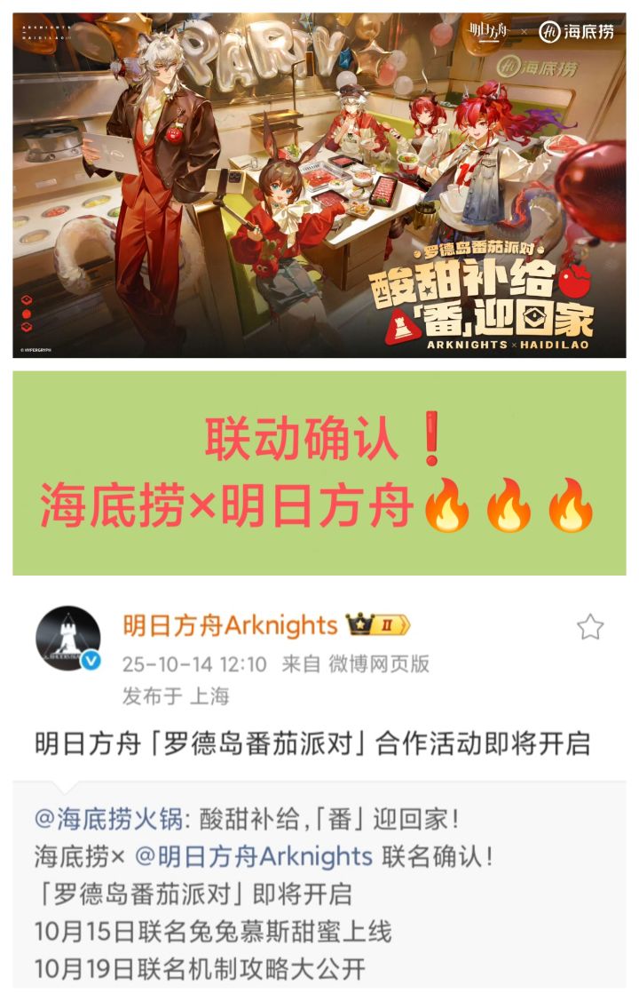 10/14号上午,海底捞火锅发微博确认与《明日方舟》进行联动