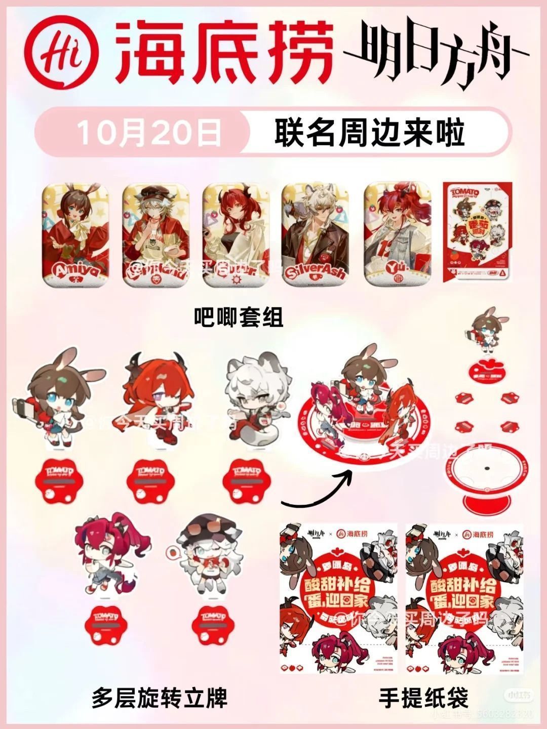 联动主题就是番茄锅了,还是6斤的!联动周边也是四面八方全泄露了,就连购物平台也都上架预购了。多层旋转立牌,手提纸袋,还有吧唧等等