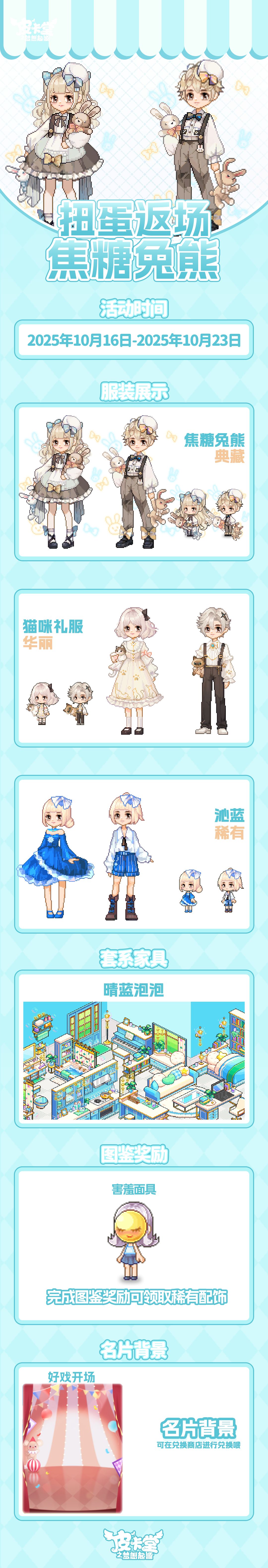-【限时金币扭蛋】返场!可使用限时扭蛋券/金币抽取,参与可获得典藏套装「焦糖兔熊」、华丽套装「猫咪礼服」、稀有套装「沁蓝」,套系家具「晴蓝泡泡」!完成图鉴收集任务可获得配饰「害羞面具」!