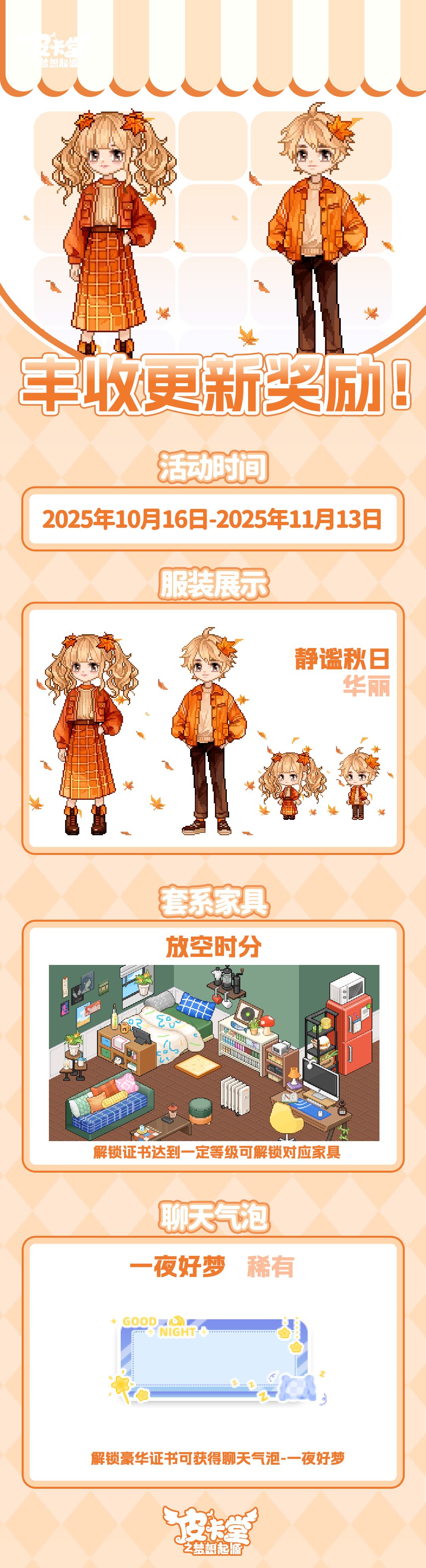 -【丰收通行证】更新上线,解锁丰收高级证书可获得证书积分,可兑换当期丰收的限定家具「放空时分」、购买通行证并完成对应任务可获得华丽套装「静谧秋日」,加购高级通行证可获得本期丰收活动限定聊天气泡「一夜好梦」。