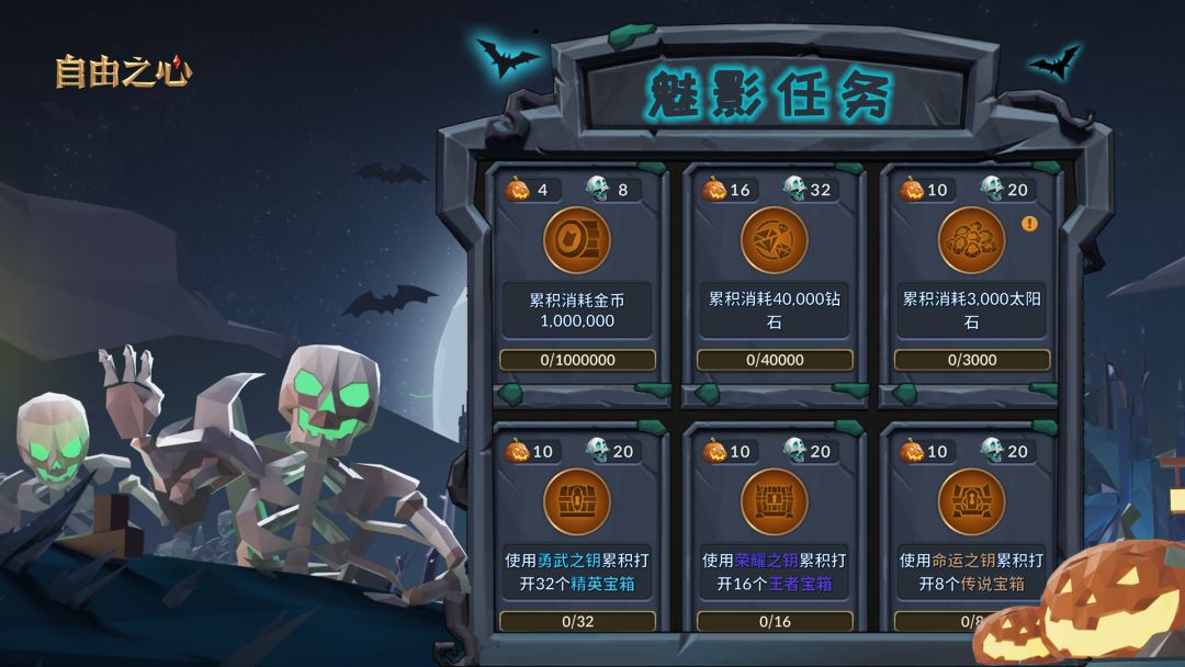 - 在活动期间消耗各种物资,可完成“魅影任务”,并获得活动道具“恐怖骷髅”和“幸运南瓜”;