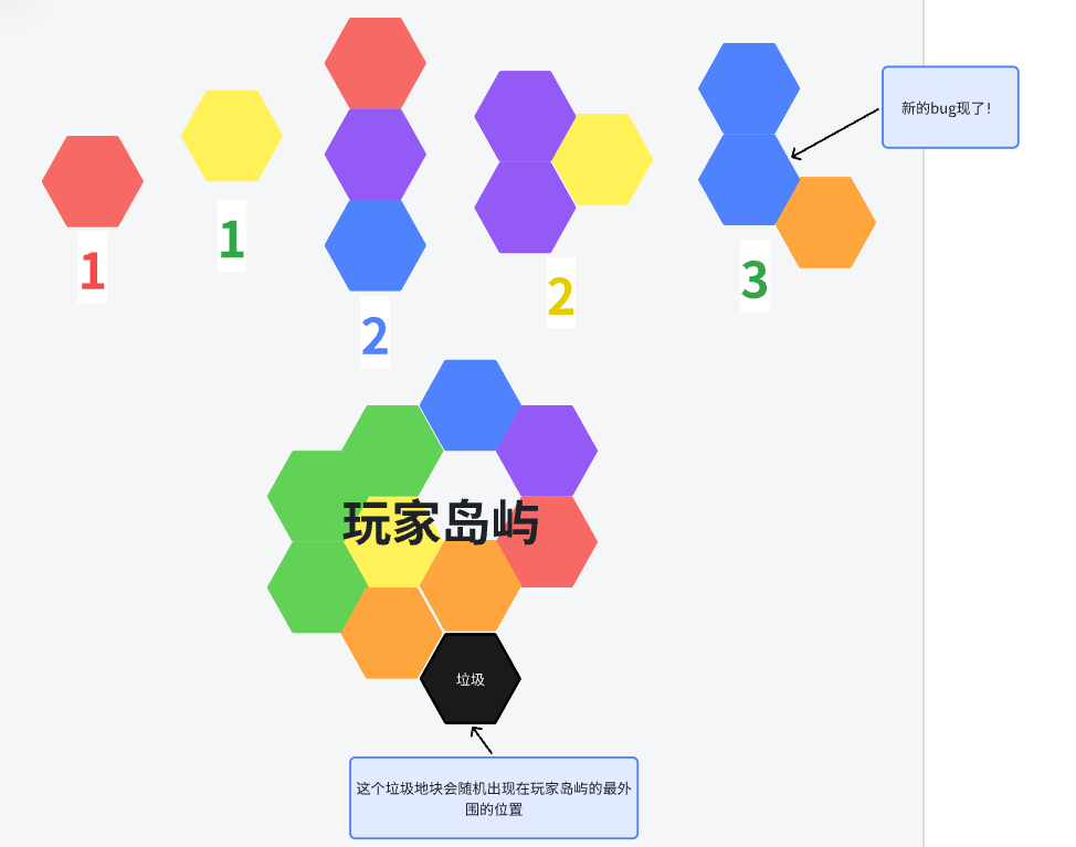 一个由bug地块组成的六角图形,方便玩家在这个基础上向任何他们喜欢的方向堆叠新的bug。当然了,游戏中不会只有一种bug,不然游玩的流程就会显得无聊。这里我们先用不同颜色的地块来表示不同的bug