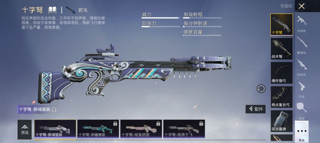 其他武器:十字弩,战术弩,爆炸猎弓,燃点复合弓,突击盾牌,迫击炮。
