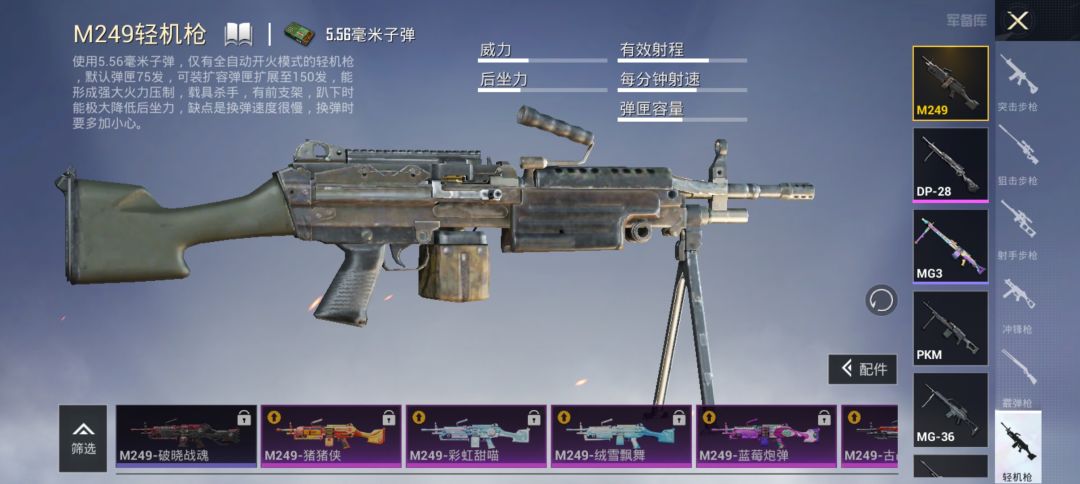 轻机枪:M249,DP-28,MG3,PKM,MG36,M338。