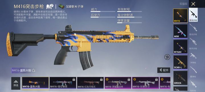 突击步枪:M416,AKM(AK47),SCAR-L,GROZA(狗杂),AUG,QBZ,M762,MK47,VAL,G36C,蜜獾,FAMAS,ACE32,ARX。