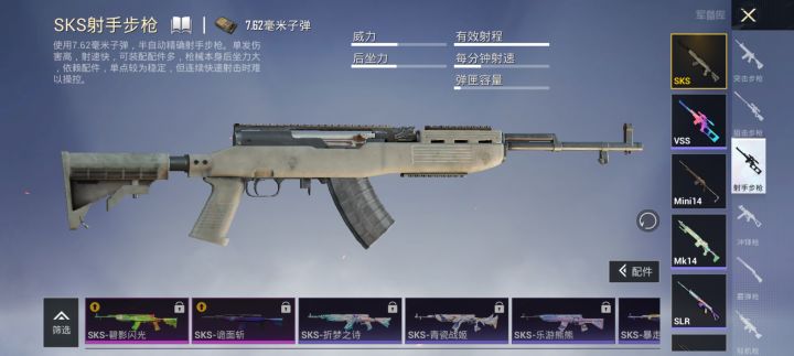 射手步枪:SKS,VSS,Mini14,SLR,QBU,MK14(妹控)MK12,M417,MK20-H,M1加兰德。