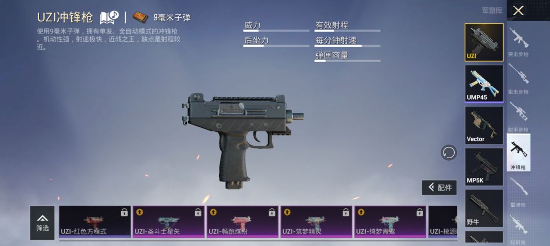 冲峰枪:UZI,UNP45(UMP9),Vector,MP5K(MP5),野牛,P90,汤姆迅,AKS-74U,JS9。