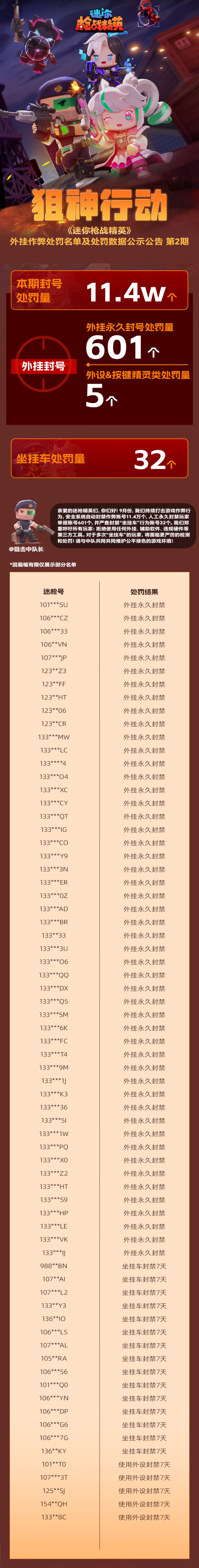 亲爱的枪战精英们,你们好!九月份安全系统自动封禁账号11.4万个,近期十月份我们针对游戏内外挂作弊等违规游戏行为进行了严格检测以及玩家的举报信息,我们确认了一批使用了“外挂作弊”的名单,经过数据抓取与分析,我们人工对有违规行为举报账号638个做出了封禁处罚,其中人工永久封禁玩家举报账号601个,并严查7天封禁 “坐挂车” 行为账号32个,决定对他们给予对应的检测和处罚。现将处罚名单进行公示,希望他们以此为戒,情节严重作弊最高可致永久封号。