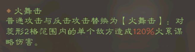 怒气技”火烧赤壁“则是具有超大的影响范围,能对直线5×3范围内的所有敌人造成火系谋略伤害,同时能触发敌人身上的debuff持续效果伤害,如果范围内只有1名敌军,能结算最多3回合所有持续效果伤害,且所触发的debuff并不移除。