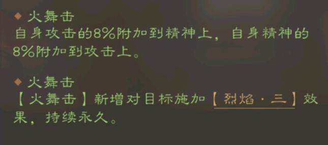 周瑜的神兵效果最亮眼的地方是,能将普攻与反击转为【火舞击】,对 2 格范围内的单个敌方造成永久的【烈焰・三】(真实伤害效果),搭配天赋水火并济就能无限叠加真实伤害BUFF,这也就意味着周瑜在战场上能够越战越勇,具有超强的持续作战能力。此外,‘自身攻击的 8% 附加到精神上,自身精神的 8% 附加到攻击上’的双攻互转机制能够极大提升周瑜的面板伤害。
