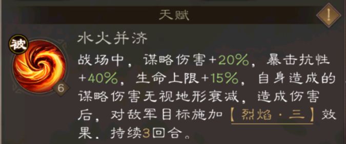 而”惊涛覆敌“则是一个偏增益性的技能,在给敌人造成水系谋略伤害的同时,还能缩减主动技能【烈火破军】的冷却时间,并且增加自身怒气值,使得周瑜能够更加频繁的使用怒气技【火烧赤壁】。