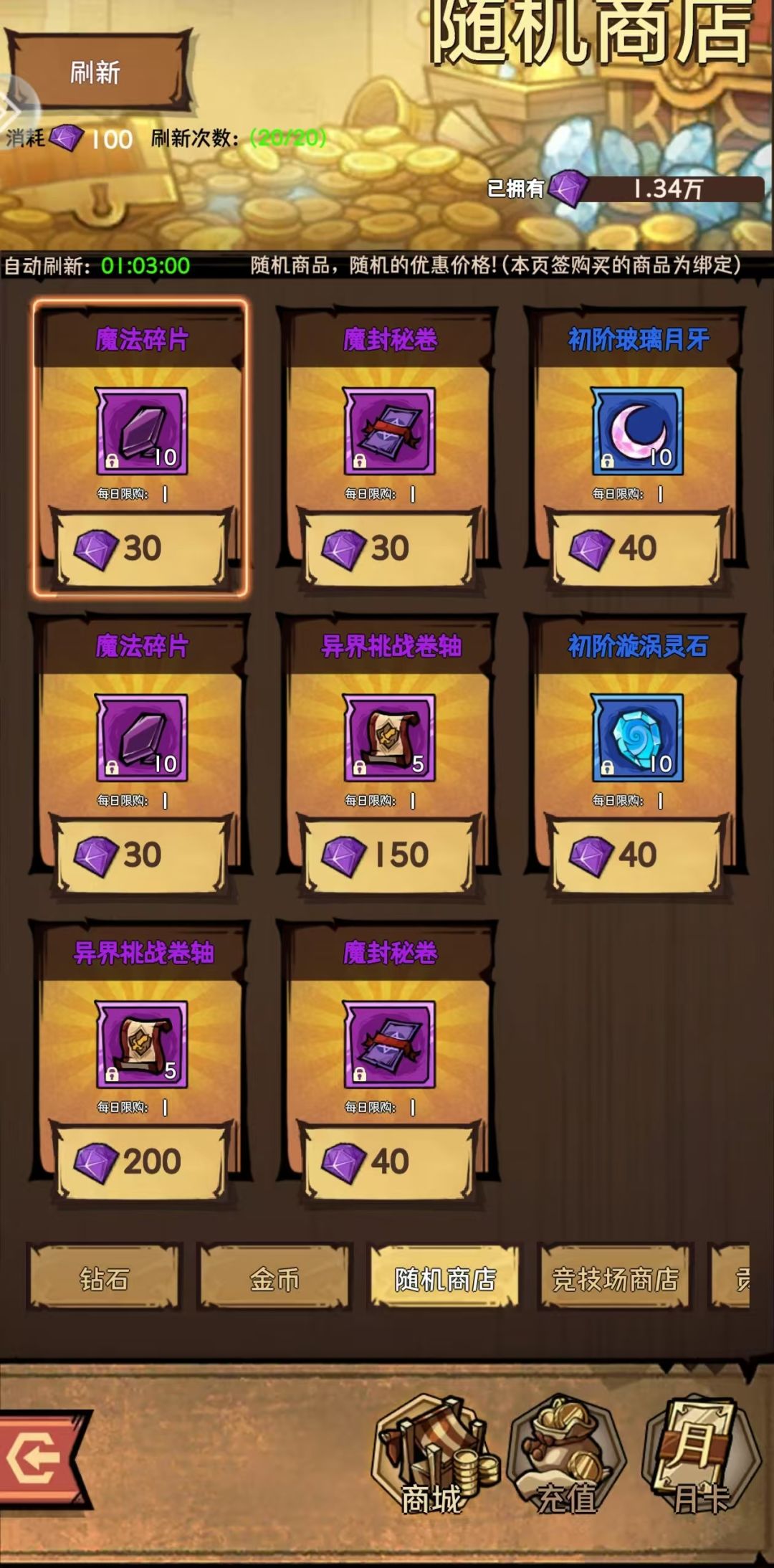 这里还要强调一下,商城金币区,除了魔法刻印卷轴,能买的都买;随机商店里晋升突破石(这个是重点,后期很缺,除非你拿钻石买),古老的宝藏钥匙,魔封秘卷,异界挑战都是需要买的,如果你开了月卡交易,解绑卷也是必买的。