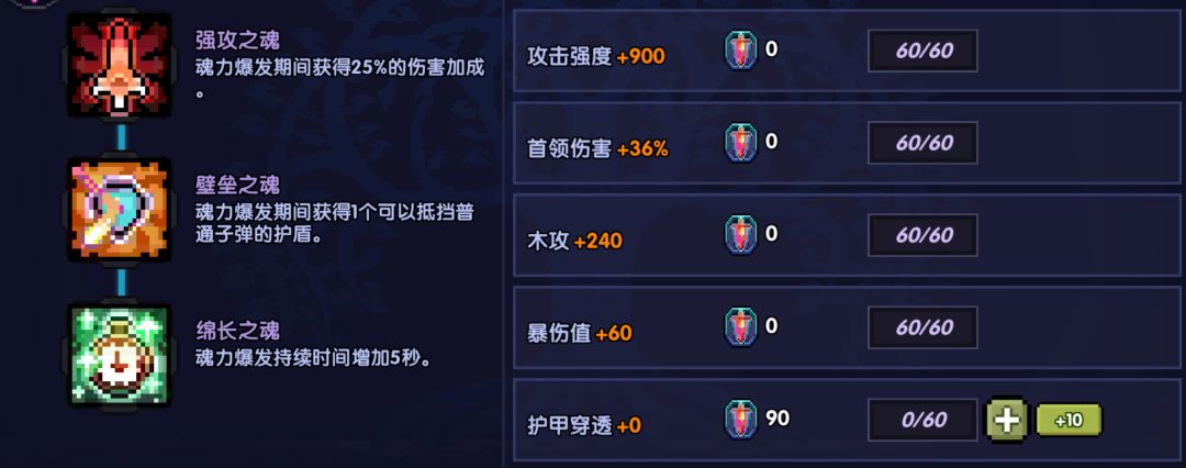 对于魂点不够用的同学,在满足穿透和暴击的前提下,各项属性平均分配点取,或者可根据自己面板来自己调整加点