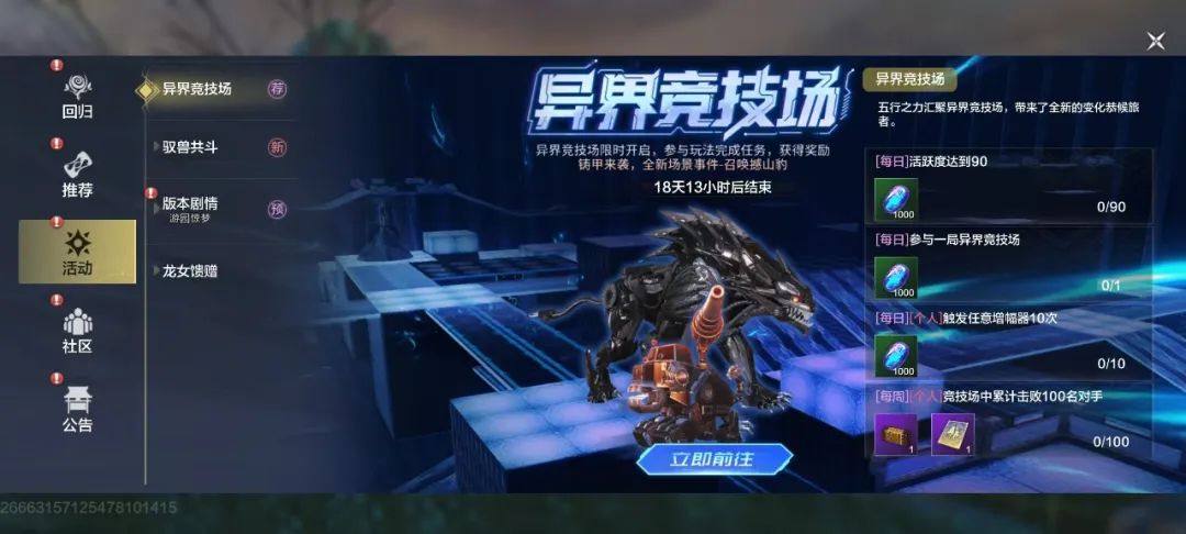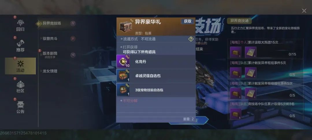 参与异界竞技场玩法,使用局内增幅器、触发各种事件等,即可领取化育丹、3级宠物技能书、山海一锅出、山海雅集等好礼~