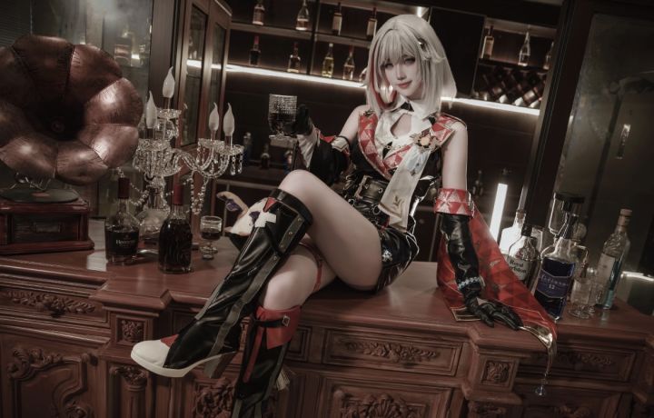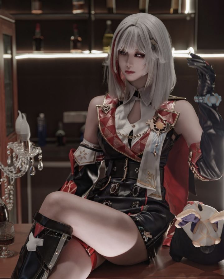 这套cosplay的还原度与氛围感都堪称一绝!银白挑染红的发丝精准契合角色设定,服饰细节更是处处用心——红黑主调的皮革质感、菱形纹路的肩饰、链条与徽章的搭配,完美复刻出角色的华丽与飒爽;手套、靴具的设计也丝毫不含糊,每一处金属扣与纹样都尽显精致。加上酒吧场景的衬托,你将角色那优雅又带点冷艳的气场演绎得淋漓尽致,仿佛从原作中走出的真人版,这份对角色的用心太让人惊艳了!