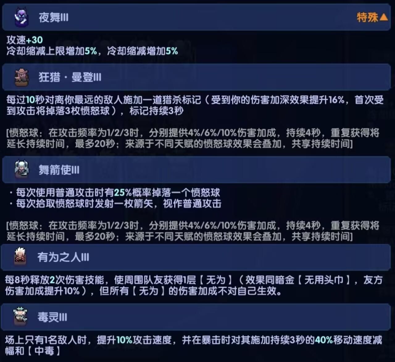ps:主要就这五个天赋,其他的带带保命天赋和攻速冷却即可。