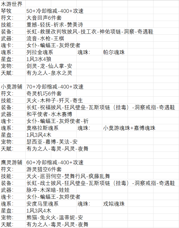 前言:本次更新的新木游侠符文和魂珠上都有能辅助的功能存在,然后不同角色的天火能互相叠加,所有双游辅可以作为木系辅助替换掉原来的天国或者灭魂。(双游辅比较赌,特别是木游世界,如果不能在卡快照的时候吃到木种子那么伤害跟灭魂比相差无几)