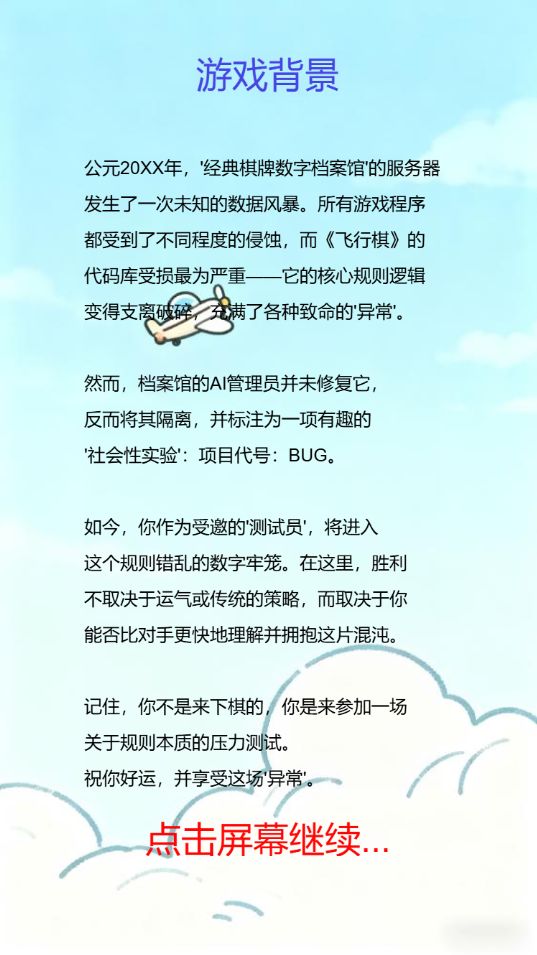 公元20XX年,“经典棋牌数字档案馆”的服务器发生了一次未知的数据风暴。所有游戏程序都受到了不同程度的侵蚀,而《飞行棋》的代码库受损最为严重——它的核心规则逻辑变得支离破碎,充满了各种致命的“异常”。然而,档案馆的AI管理员并未修复它,反而将其隔离,并标注为一项有趣的“社会性实验”:项目代号:BUG。如今,你作为受邀的“测试员”,将进入这个规则错乱的数字牢笼。在这里,胜利不取决于运气或传统的策略,而取决于你能否比对手更快地理解并拥抱这片混沌。记住,你不是来下棋的,你是来参加一场关于规则本质的压力测试。祝你好运,并享受这场“异常”。