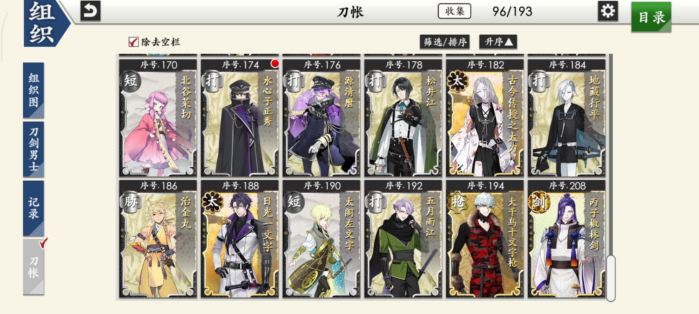 蜂须贺虎彻11,长曾弥虎彻9,和泉守兼定6,歌仙兼定3
