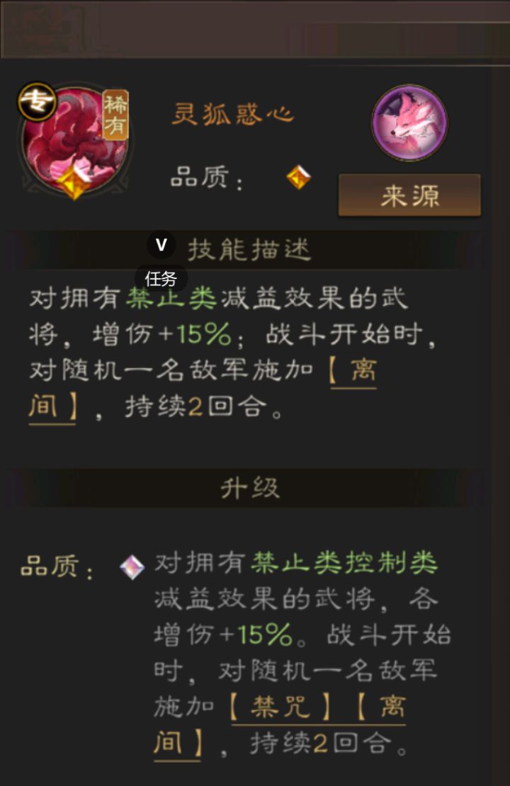 初级形态:对拥有禁止内减益武将增伤15%战斗开始时,对随机一名敌人施加离间持续两回合,这个跟貂诱惑有点类似!