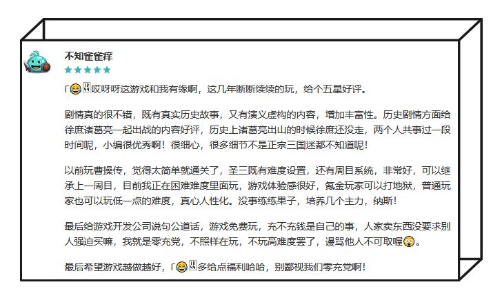 每个月初,我们都将挑选出上月的精选评论,并展示在Tap社区,欢迎各位主公前往评论区(https://www.taptap.com/app/177887/review)进行评论发表,大胆吐槽,尽情说出你们的想法及建议~