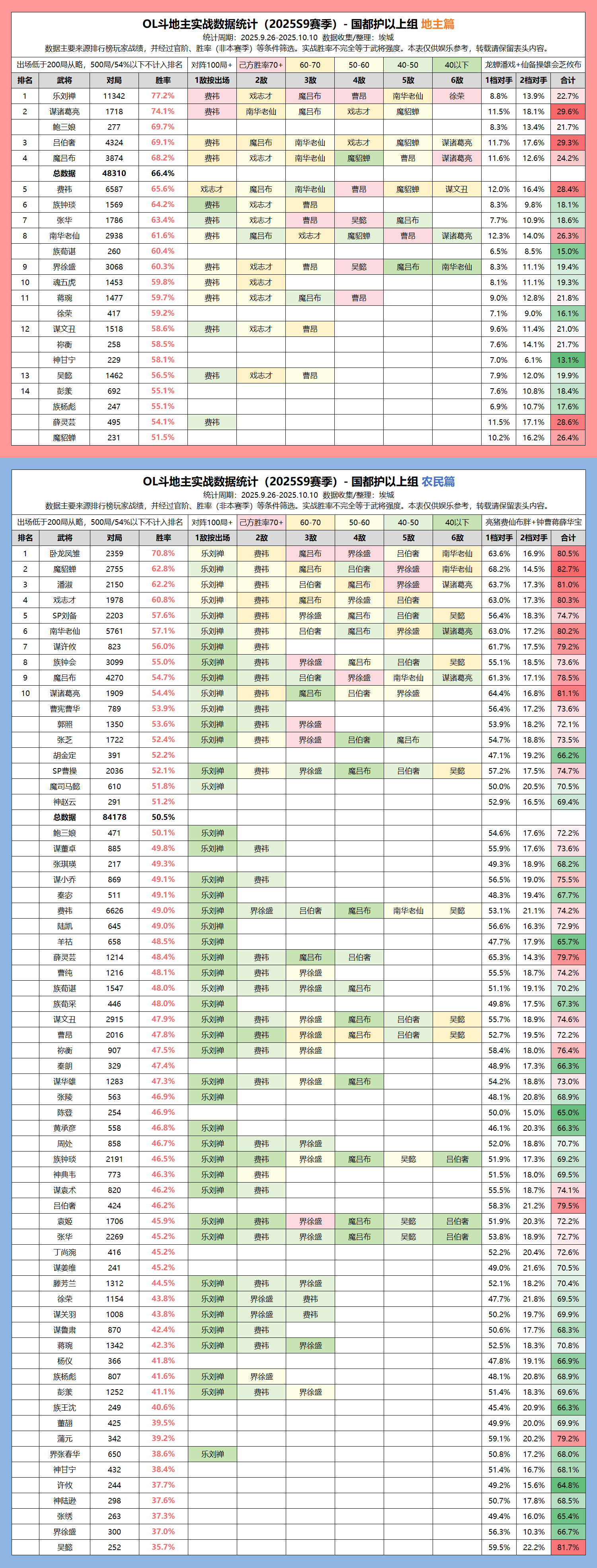 由于样本较往期少,所以总表里把出场200-500之间的武将也列了进来,但不参与排名。