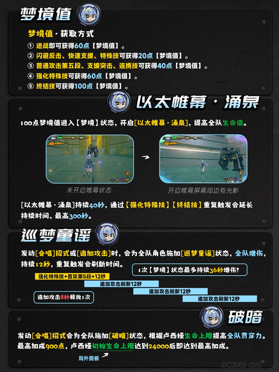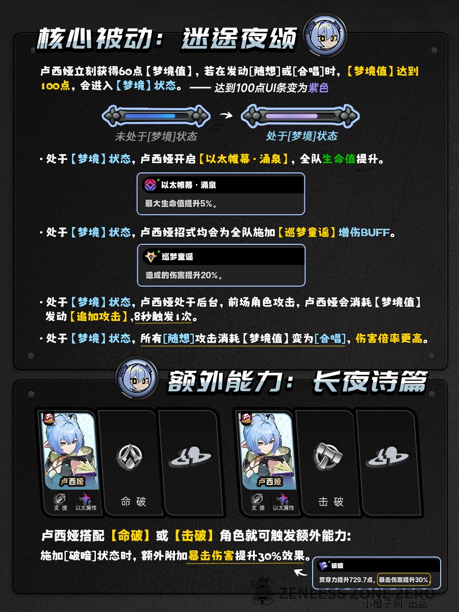 ——卢西娅不在[梦境]状态才会回复梦境值。② 进入[梦境]状态时,会触发1次向下切人的【快速支援】,并开启[以太帷幕·涌泉],帷幕生效期间,全队角色最大生命值获得提高。