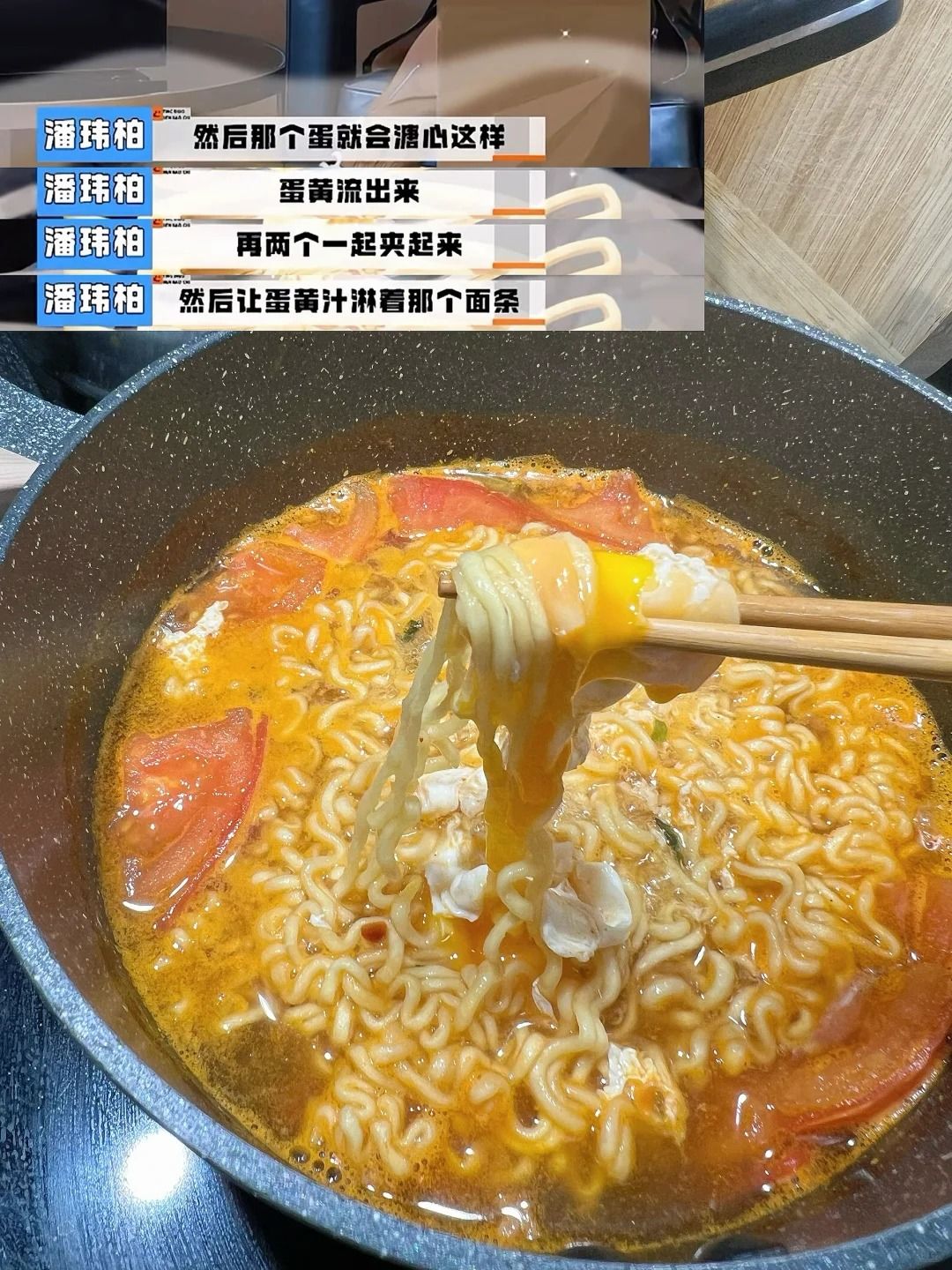 真的是糖心蛋😆蛋黄戳破会顺着面条🍜流下来 让面条的口感更爽滑 但是其实我感觉不是潘帅的方法让这个拉面变好吃了…是这个辛拉面本来就很好吃啊😂😂😂