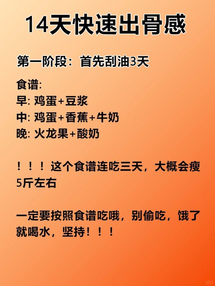 早餐鸡蛋 + 豆浆,午餐鸡蛋 + 香蕉 + 牛奶,晚餐火龙果 + 酸奶。坚持 3 天,轻松掉 5 斤左右,千万别偷吃,饿了就喝水!