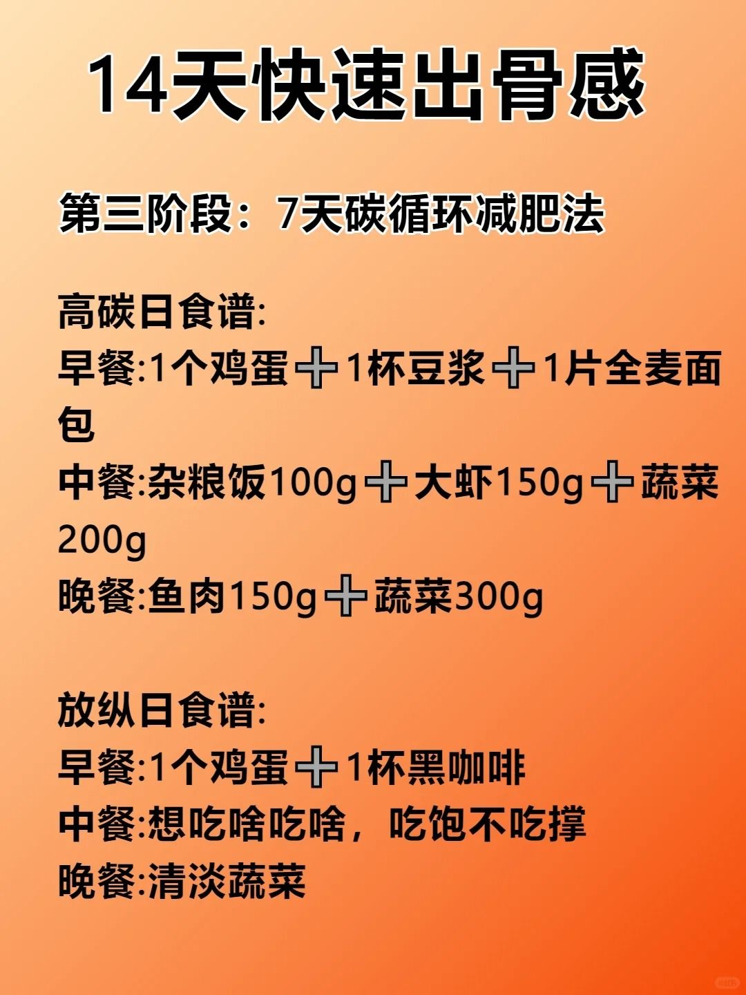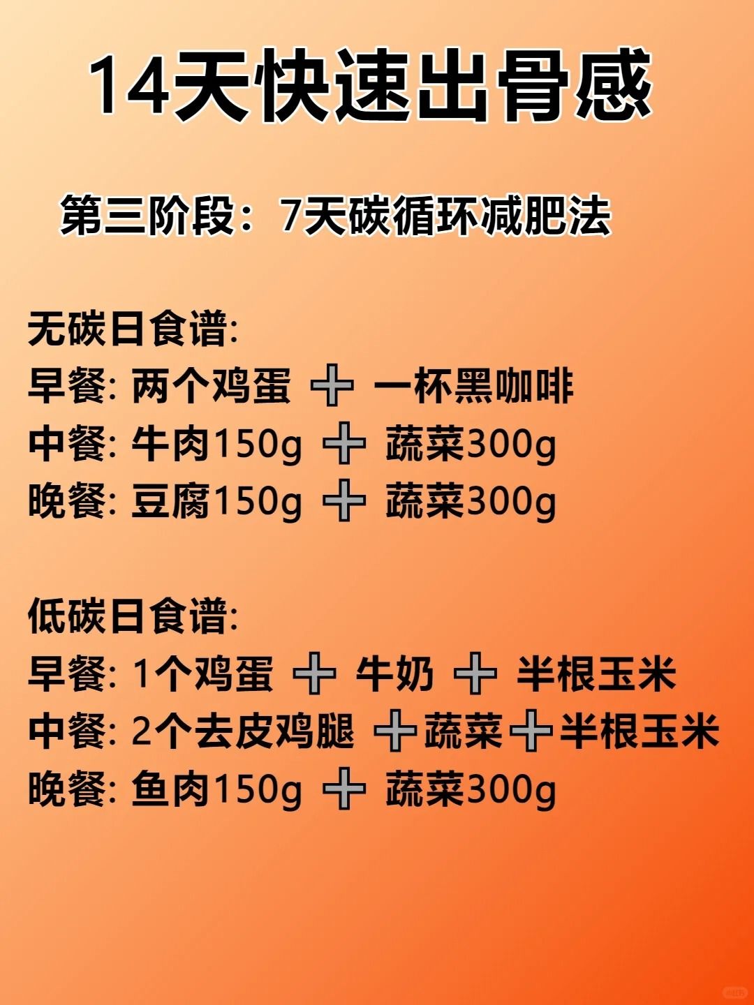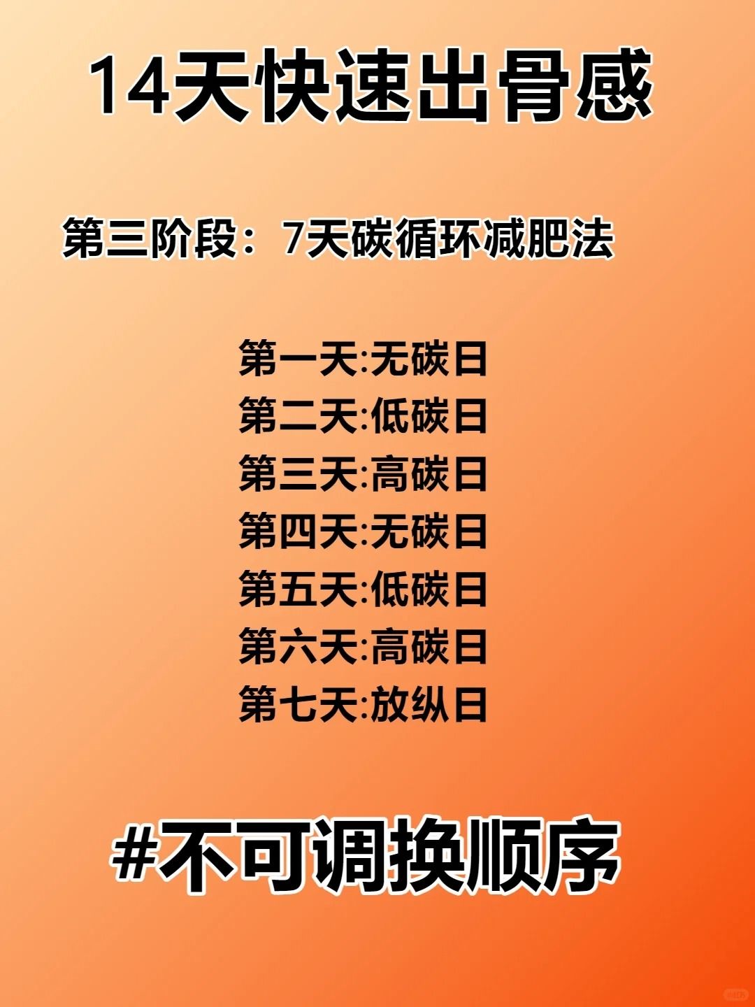 无碳、低碳、高碳日交替,还有放纵日。无碳日吃鸡蛋、牛肉等;低碳日有玉米、去皮鸡腿;高碳日加全麦面包、杂粮饭;放纵日中餐随便吃,晚餐清淡蔬菜。顺序别调换~