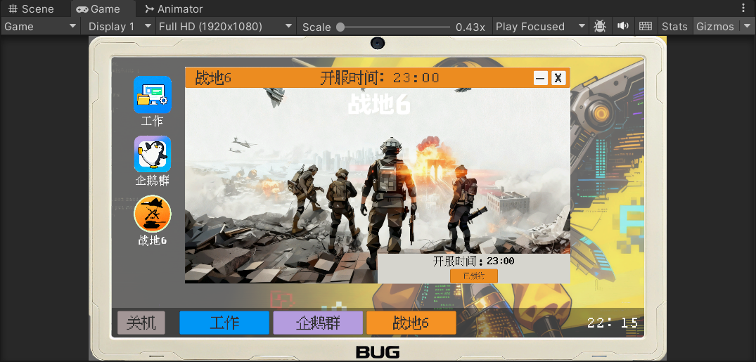 今天已经是day6了,在经历了4天思考设计,2天全力拼接UI后,终于是将游戏电脑页面场景拼完了,虽然代码还一个字未动,但单人solo这进度已经很满意了。