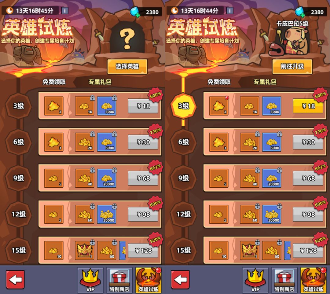 活动期间,指挥官们可以自选一名英雄参与试炼,参与试炼的英雄到达指定等级后可领取免费奖励,并可购买专属等级礼包,为英雄的成长助力。