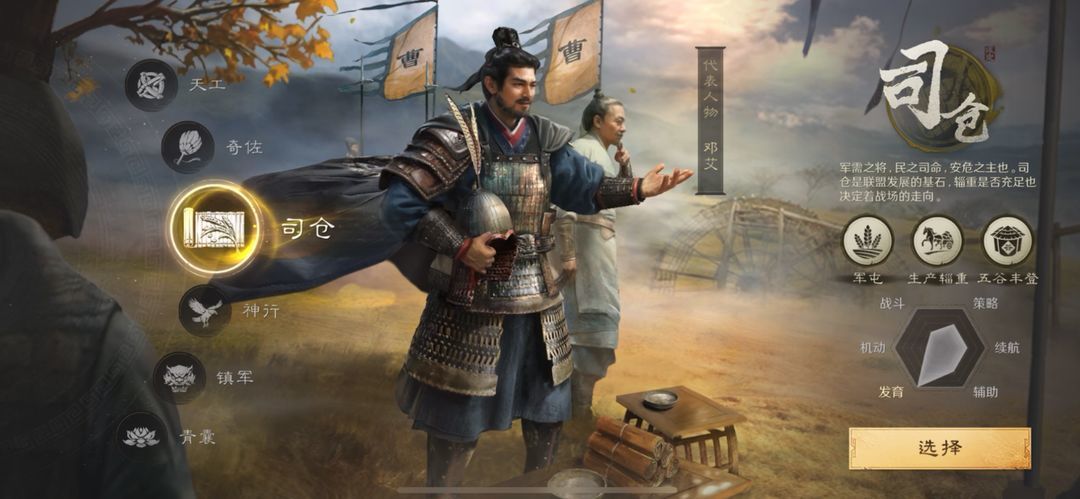 司仓:堪称同盟的“后勤心脏”,操作简单,主要是提升资源产量,在资源获取上有非常大的优势。技能可生产辎重,增加同盟粮食,关键可以开启军屯为盟友提供额外资源,第一次玩的话,这个职业非常非常推荐。